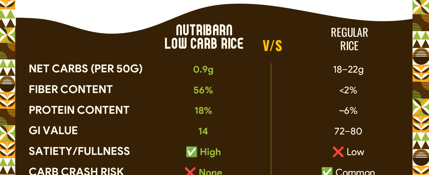 - TASTE IDENTICAL : Nutribarn High Fibre Rice is taste Identical to Regular Rice. We work hard to ensure that you can enjoy yourself even on a low-carb lifestyle without compromising on taste.